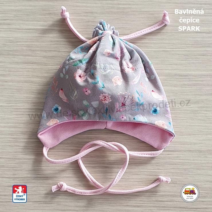 - Bavlněná čepice Spark zavazovací /9.717/ Kytička na šedé vel.XS (0-2měs)