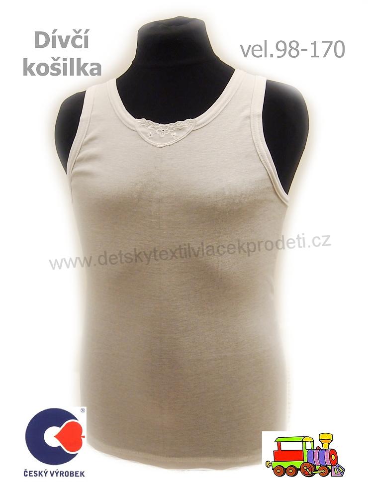 Bavlněná dívčí košilka /nátělník/ české výroby, velmi příjemná na nošení, ramínka jsou širší a nesklouzávají. Na předním díle aplikace krajky. Drží tvar i po vyprání, nestává se, jak je běžné u dovozových levných výrobků, že je s každým dalším praním širší a kratší.