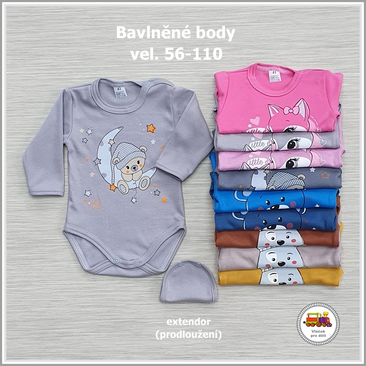 Poznámka z Vláčku: Body jsou kvalitní a gramáž bavlny vás příjemně překvapí. Skvělým bonusem je možnost dokoupení extendorů (prodloužení) ve stejném odstínu bavlny. Takže už se vám nestane, že má prcek ještě jakž takž dobrou délku rukávu, ale už je body krátké do rozkroku.