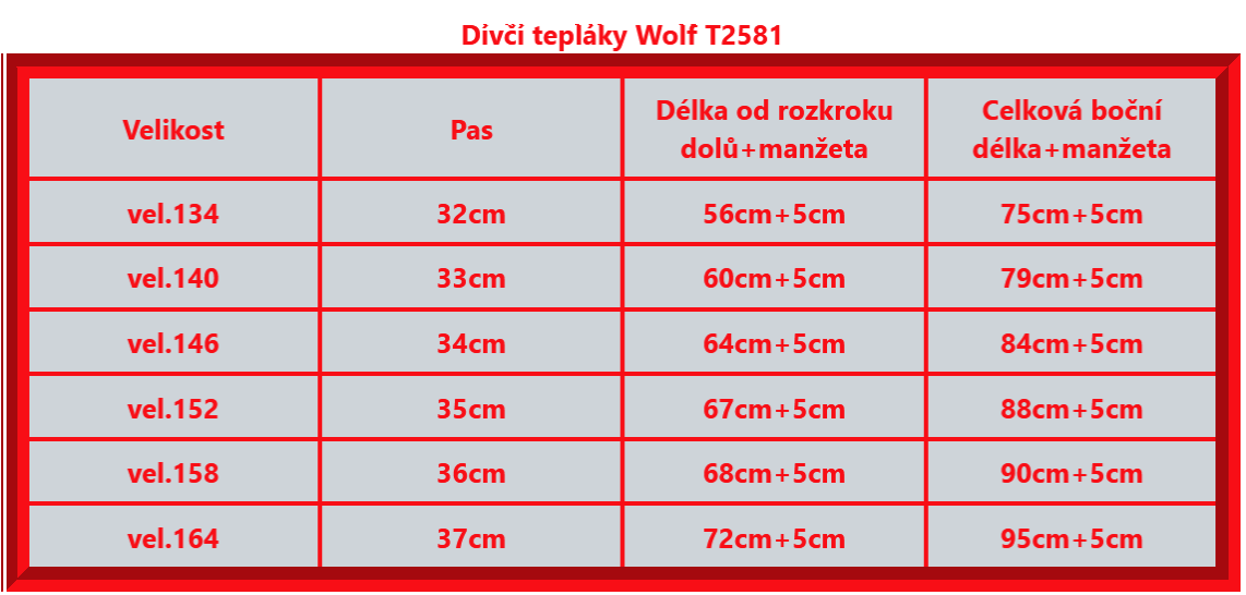 - Klikněte na kategorii Dívčí tepláky a uvidíte tabulku s mírou od rozkroku (bez manžety).